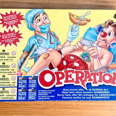 Med det klassiske elektroniske brettspillet Operation kan barn leke \"lege \" og utføre \"kirurgi \" for å gjøre Kalle Anka friskere – ellers får de summeren.