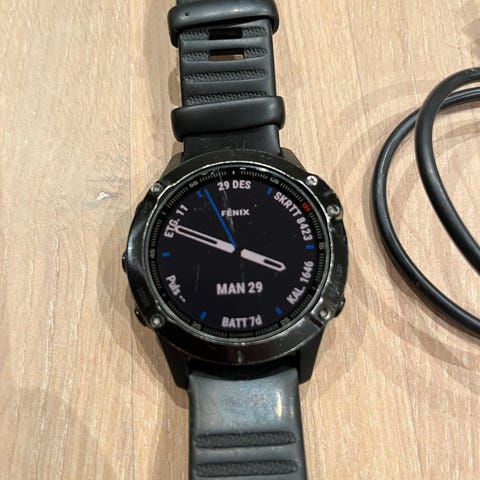 Garmin Fenix 6 Sapphire smartklokke. Gul reim er nylig satt på da svart er slitt. God kapasitet på batteriet. Skjermen har ingen striper. Minimalt med lakk slitasje på bezel. Fungerer fint, ikke hatt noe problemer med klokken, selges pga oppgradering til fenix 8.