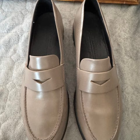 Andrea Loafers i skinn fra Sézane. Str 38 i fargen taupe/hvit. Klassiske fine sko som passer til d meste, både skjørt, kjoler og bukser. Kjøpt for 2400 kr på Sézane, og kun brukt en gang. Gode på foten. Vil si dette er en standard str 38. Sendes uten eske. #loafers #sezane #mokkasiner