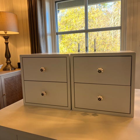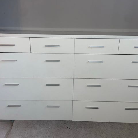 IKEA Alfred Homann møbelsett bestående av flere hvite møbler med skuffer og hyller. Settet inkluderer et nattbord med to skuffer, et skap med flere rom, og en kommode med tre skuffer. Møblene er laget i tremateriale og har et enkelt design.300 kr stk