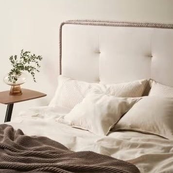 Pen og komfortabel seng i moderne design med høy, knappet sengegavl som gir et eksklusivt uttrykk.