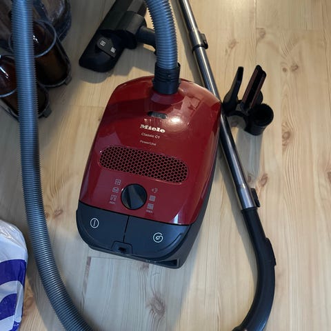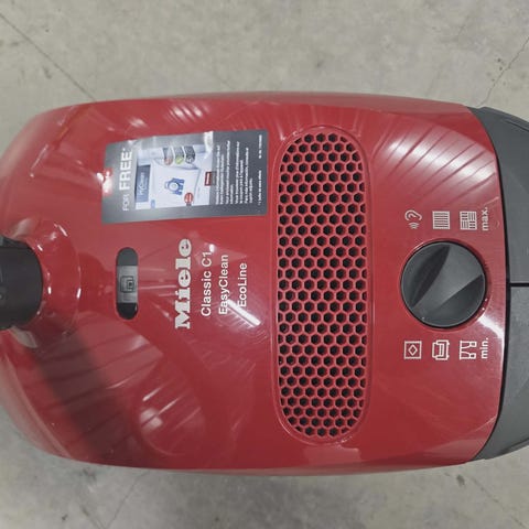 Miele Classic C EcoLine støvsuger i rød farge. Modellen har justerbar effektinnstilling og er designet for effektiv rengjøring. Produktet leveres med slange og tilbehør for ulike rengjøringsoppgaver.