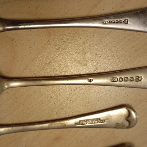 Sukkerkopp og fløtemugge i gullsmedplett fra Magnus Aase / Theodor Olsen Eftf. i Bergen. Begge deler stemplet på innsiden av håndtaket med GP, Magnus Aase sitt stempel og nr. 232 (mønsternumer).