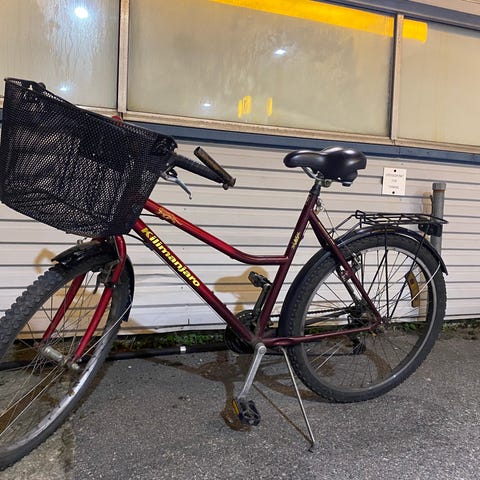 Sykkelen har 18 gir, stor og fin kurv, bagasjebrett og skjermer foran og bak.