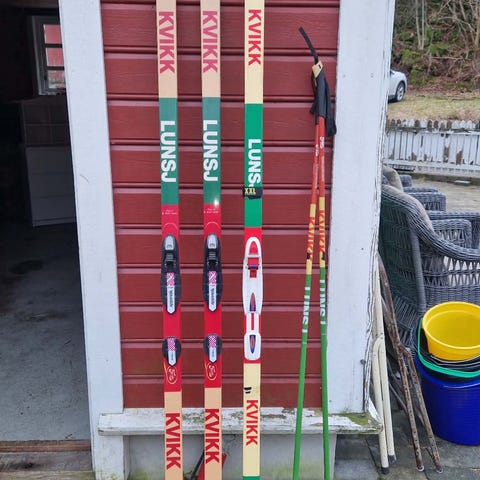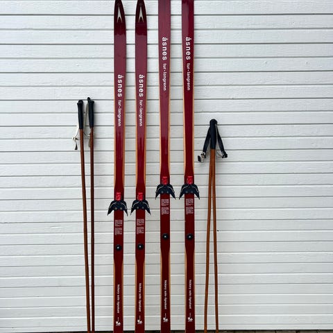 En fine eksemplarer av ekte langrennski produsert i Norge! Langrennski laga av tre. Emblem med ein skiløpar på baktupp, samt eit mindre emblem med ein stilisert fjelltopp. Metallbeslag på baktupp. Åsnes skifabrikk - Trysil Knut. Pynte veggen på hytta med en skjelden eksempler av langrenn ski historie. Med staver fraTrygve Liljedahl's stavfabrikk i Lillehammer. Kan sende etter avtalen.
