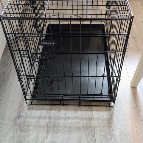 hundebur i plast med metallgitterdør. Fargen er grå. Vi har brukt buret til en 7kg mittelspitz.