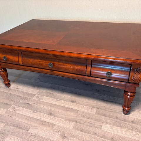 Solid sofabord med glass i eik selges. Bruksmerker finnes. Lengde 108cm, høyde 45cm, bredde 68,5cm
