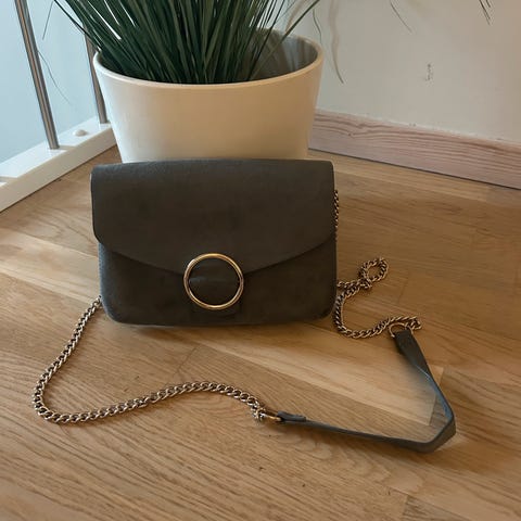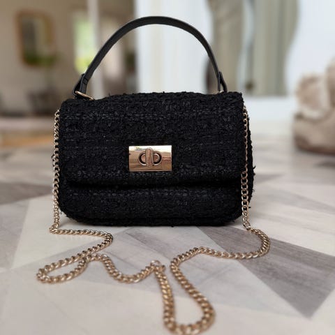 H&M dame veske laget i stoff. Vesken har en svart farge og metallramme med klemmeåpning. Egnet til bruk som en liten håndveske eller lommebok.