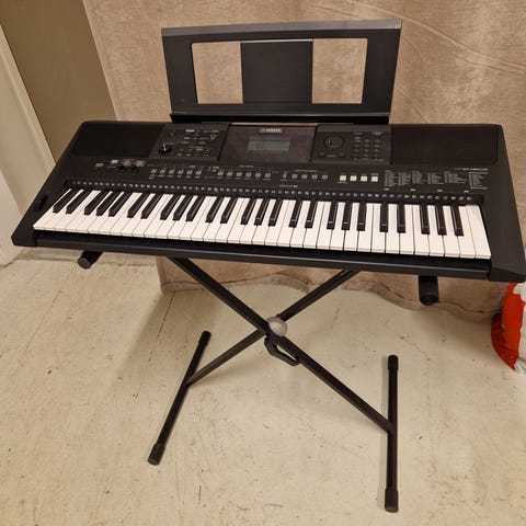 Pent brukt keyboard Yamaha psr s770, Strømforsyning, noteholder og keyboardstativ inkludert