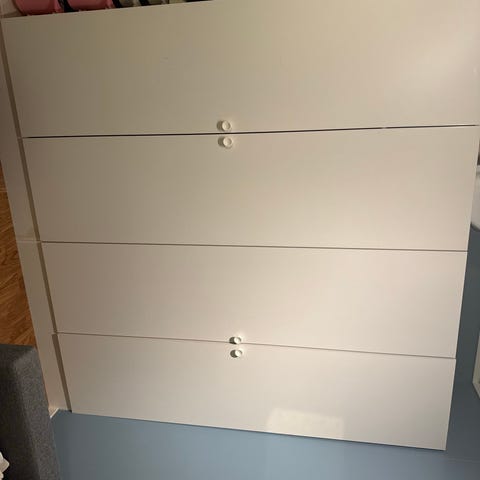 Vi skal bytte ut skap og gir bort det som står her. Spikrene i bakplatene har løsnet, og må spikres på plass igjen. Dermed er det foreløpig litt «lealaust» når man beveger på det, men de to bakplatene på tvers står stødig. Ellers har skapet fungert helt fint i bruk.