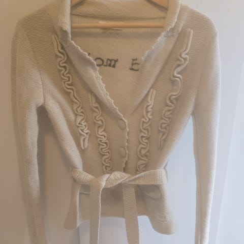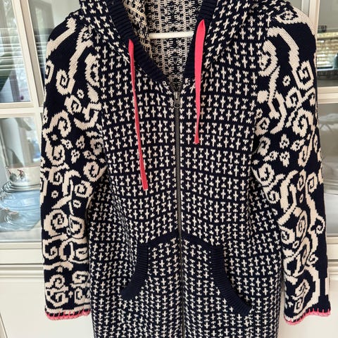 Flott strikkejakke i ull med glidelås og fint merke på ryggen