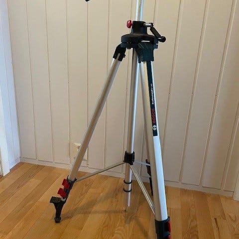 Pro Tech Cross Laser med stativ. Laserverktøy for presis oppmerking og nivellering. Utstyrt med stativ for stabil plassering under bruk.
