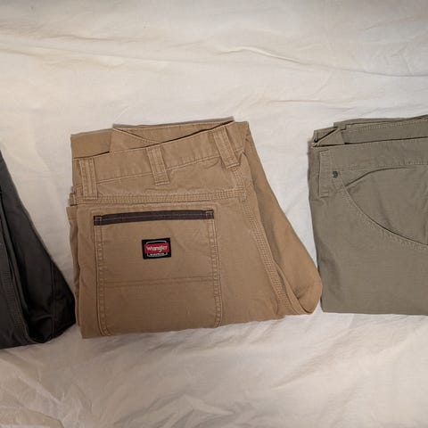 Grønn bukse fra Carhartt. Sømmen er tatt opp ved anklene og det er også noen hull/heelbite ved buksebena. Håper noen likevel kan få glede av de her buksene!