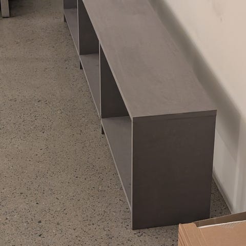 Snekkerbygd TV-benk med hyller og bokhylle. Bokhyllen kan tas av og plasseres frittstående. Det er laget hull for ledninger til TV, dekoder.
