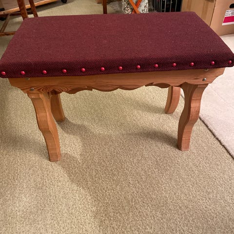 Et spesielt og dekorativt trekk er original bakside av benken, som er kledd med gamle illustrasjoner/trykk (maritime og historiske motiver). Dette gir møbelet et helt unikt preg og gjør det spesielt godt egnet til å stå fritt i rommet.