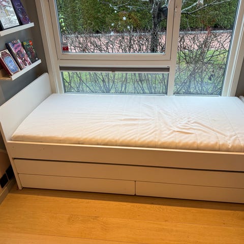 Sengen har trelamellbunn. En av lamellene er knekt, fikses lett med patentbånd e.l.
