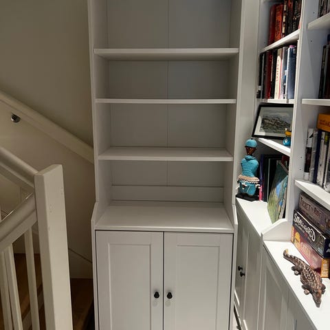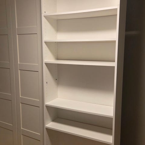 En eldre Billy bokhylle med en fast og fire justerbare hylleplater.