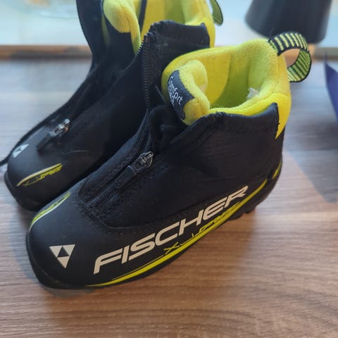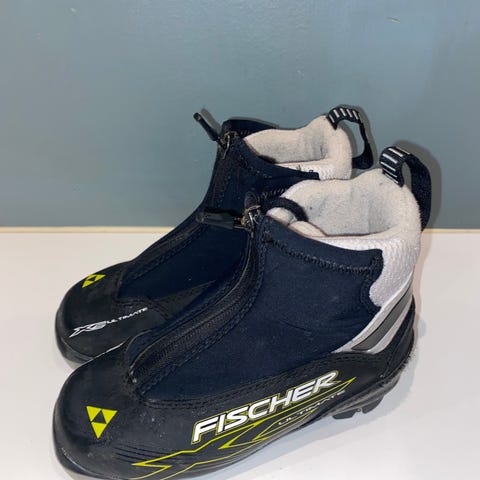 Fischer skisko i størrelse 30. Skoene har svart og gul farge, og er designet for langrenn. Materialet og detaljer er tilpasset for bruk på ski.