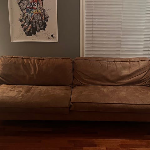 3 år gammel Westin-sofa fra Skeidar. Trukket i slitesterk eco-hud i fargen Colorado konjakk. 70% hud, 30% polyester.