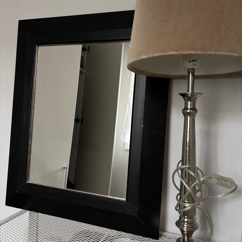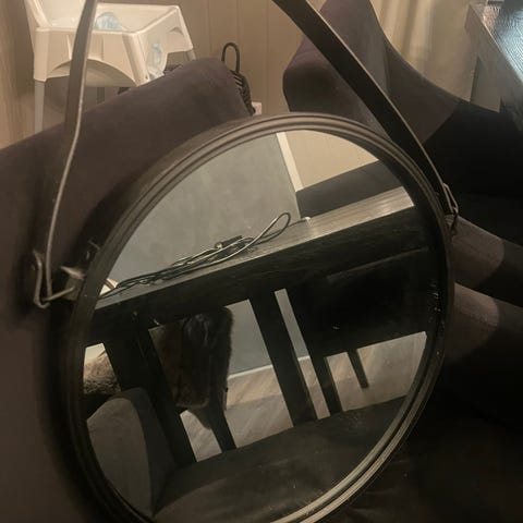 IKEA rundt speil med ramme i hvit farge. Speilet har en enkel og funksjonell design som passer til ulike rom og innredningsstiler.