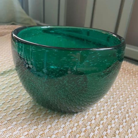 Glassbolle fra Hadeland Glassverks Grønland-serie, designet av Arne Jon Jutrem på tidlig 1950-tall. Grønt kunstglass med luftbobler, kalt luseglass. Høyde 12 cm, diameter 16 cm. Noen riper på undersiden av bollen.