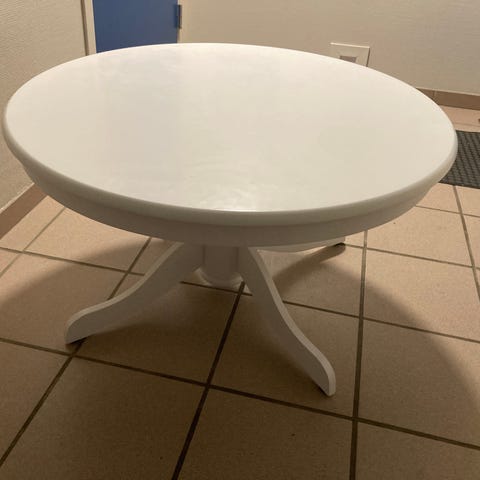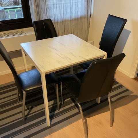 Hvitmalt kjøkkenbord med klaff og 4 stoler. Svarte stolputer følger med. Bordet er 74x120/160cm. Stolene er litt ustødige. Må hentes.