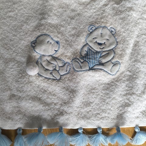 Et fint brukt brunt håndkle og et ubrukt grått håndkle selges. Til barn, med hette. Måler 75x75 cm.