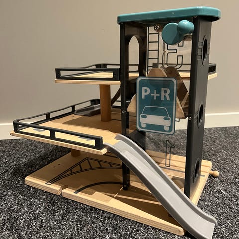 Lekebilgarasje i tre med flere etasjer, heis, landingsplass til helikopter og bensinpumpe. Medfølger to biler og en person. Har et helikopter til den også, som jeg skal prøve å lete frem:) Lite brukt, i veldig fin stand.
