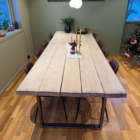 Spisebord laget av møbelsnekker. 3 meter langt. Ben av metall.