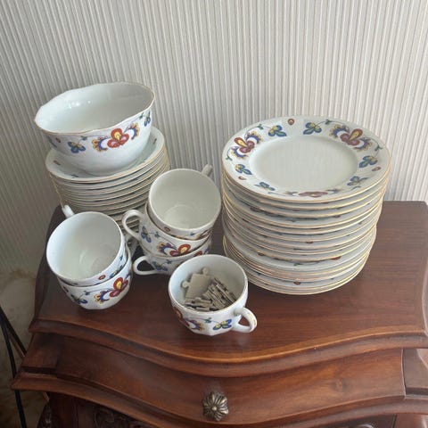 7 kopper, 7 asjetter, 9 tefat, fløtemugge og sukkerskål med rosemønster i god stand