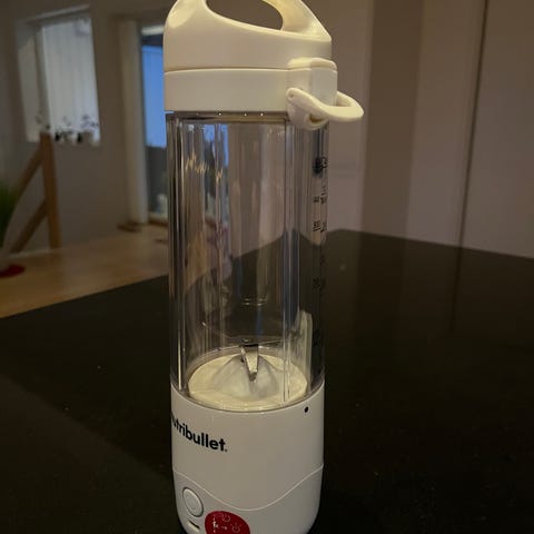 Juicing Cup bærbar blender i grønt. Inkluderer knivblad og lokk med håndtak. Designet for enkel bruk og rengjøring, egnet for å lage smoothies og juicer.