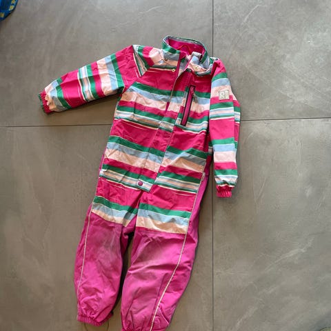 Noen «usynlige» små hull (ikke helt igjennom) ved lommepartiene grunnet lillemann sin unike evne til å fylle opp lommene med småstein😅 Mangler to knapper til å feste fotstrikkene i, men dette kan enkelt sys på.