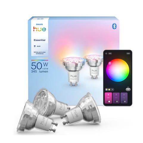 Hue White Ambiance standard spotlight-pære, 4,2W (tilsvarende 35W), GU10 spotlight-sokkel, MR16-pæreform, 2200-6500 Kelvin, 350 Lumen, opptil 15 000 timers levetid, rike farger. Styring av lyset via smartenheter med Hue-appen ved å koble til en Hue Bridge (ikke inkludert), Hue Bluetooth eller en Hue Dimmer Switch, stemmestyring med Google Home, Alexa eller Siri. 3-pakning.