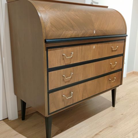 Skatoll med uttrekkbar pult i flammebjørk fra 40-tallet.