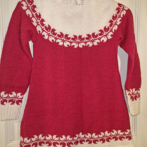 Bergans ullkjole i størrelse 116 for jenter. Kjolen er lilla og laget av ull, med mønsterdetaljer rundt halsen og på ermene. Passer til barn og kan brukes som et varmt plagg.