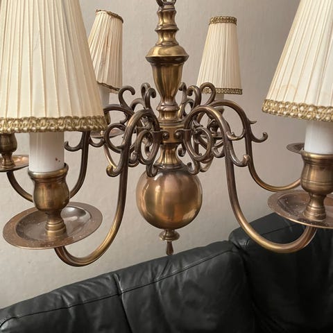 Selger en moderne og tidløs taklampe i messing med tre store dekorative pærer. Lampen gir et behagelig, varmt lys og passer perfekt over spisebord, i stue, gang eller soverom.