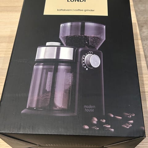 Modern house kaffekvern med justerbar innstilling for kverningsgrad. Designet for kverning av kaffebønner, med beholder for bønner og malt kaffe. Svart farge og elektrisk drift med ledning.