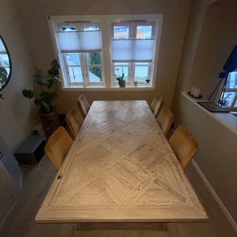 Pen og rustikk spisestue med 6 stoler. Heltre. Tungt og solid.