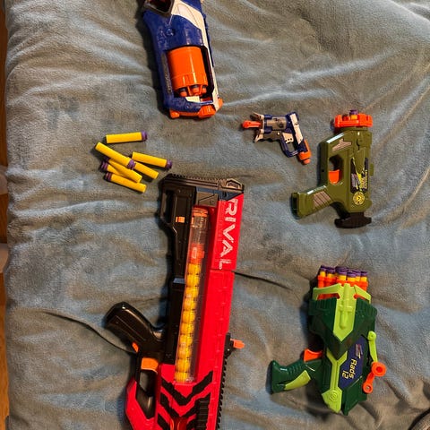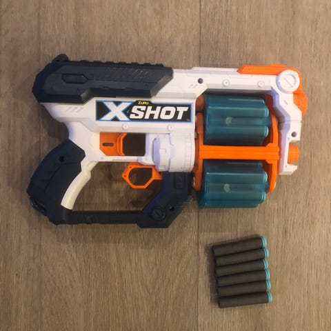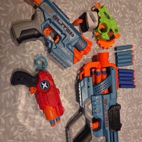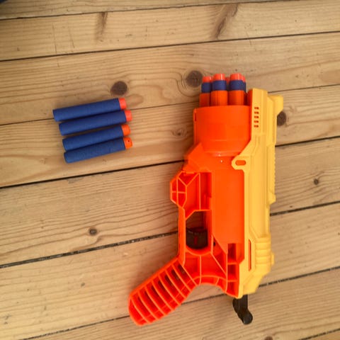 To Nerf liten dartpistol i grønn og oransje farge. Laget i plastmateriale. Egnet for barn som leketøysvåpen.