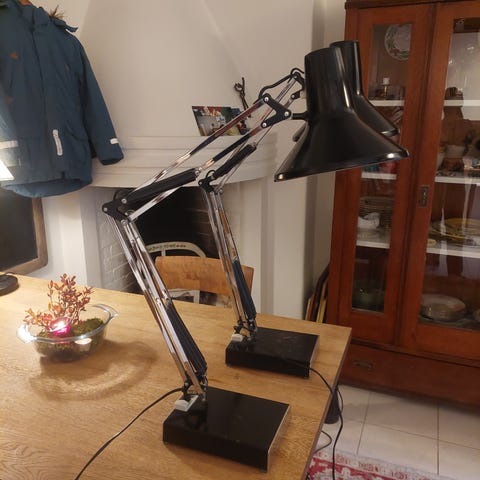 Selger to Luxo arkitektlamper. Den ene, hvite er eldst. Mulig 50-60 tallet. Godt brukt med skader i lakken og maling flekker. Men fungerer helt fint.