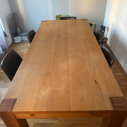 Bordet har vært i ukentlig bruk i ca 15 år, men er i god stand etter regelmessig pussing og oljing.