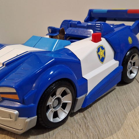Paw Patrol lekebil med tilhenger i blått og rødt. Passer for barn og kan brukes til rollelek og fantasilek.