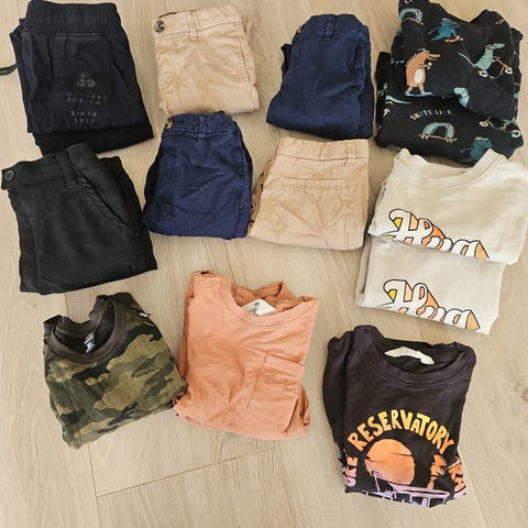 Fin klespakke til gutt selges. Bukser, penklær, flere tskjorter, langermet gensere, Wood Wood ullgenser, vinterjakke, sekk. Se bilder for hvilke str. de ulike plaggene er. Pent brukt og noe nesten ubrukt.