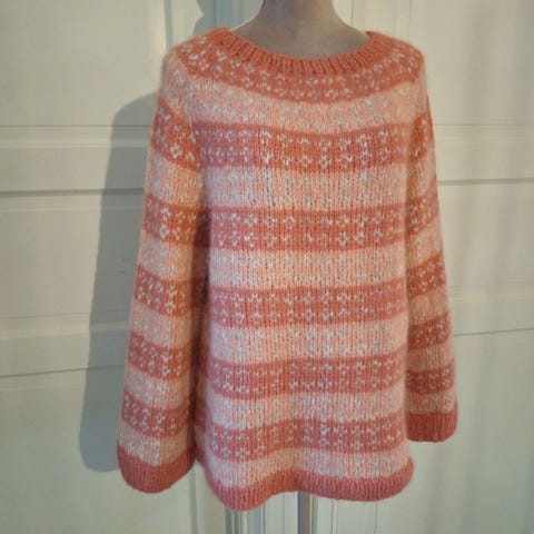 Strikket Anny genser fra Skappel og Helene Moo i ullgarn. Garnet er ekstra mykt og litt pusete så det er en veldig god genser å ha på seg. Størrelsen er XL, men denne genseren skal jo være litt oversized, så kan godt passe til en L også.