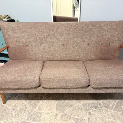 Behagelig å sitte i med myke sitteputer og faste puter i rygg.