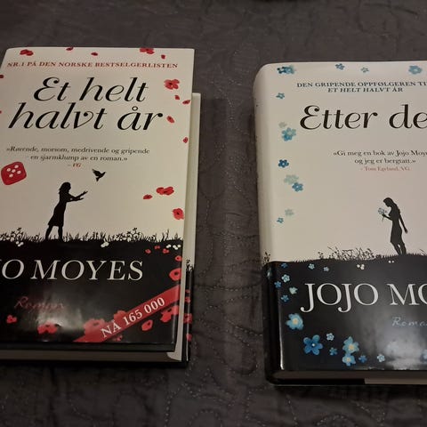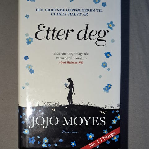 Jojo Moyes Etter deg Roman. Bok i norsk språk med omslag som viser en silhuett av en kvinne og blå blomster. Romanen er en oppfølger til boken Et helt halvt år.
