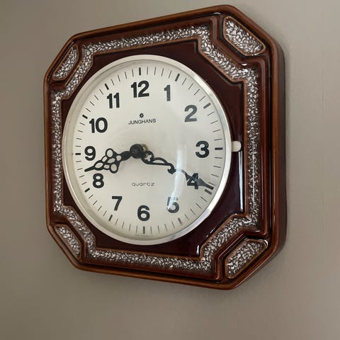 Junghans, Junghans Electronic, veggklokke, retro klokke, kjøkkenklokke, kobber, kobberpanne, panneklokke, vintage klokke, tysk design, 70-talls, 80-talls, designklokke, dekor, hytteklokke