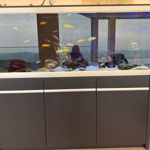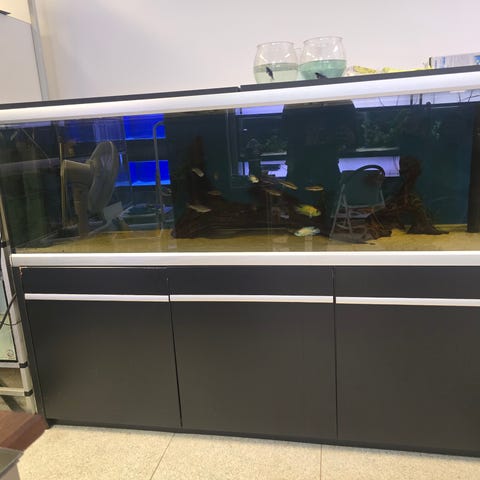 Akvariet er limt og har vært i bruk med fisk, uten lekkasje