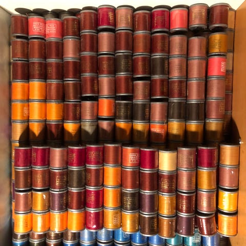 3 stk uåpnet pakker med knapper i rosa, blått og grønt. 1 stk åpnet pakke med blå knapper