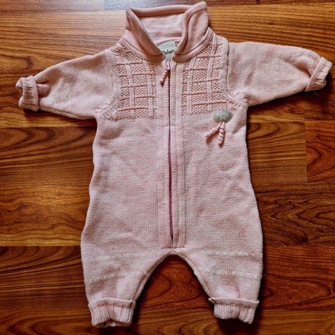 Selger en pent brukt heldress/omslagsdress til baby. Den har knyting i front og er laget i 100 % merinoull av høyeste kvalitet. Dressen er i en lys grå farge og en del av hentesettet fra Lillelam.